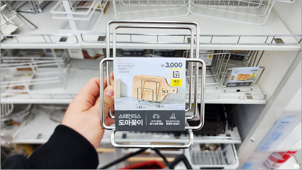 오늘 다산동에 갈 일이 있어서 다이소 매장 상품을 검색했는데, 마침 목적지 근처 매장에 '스테인리스 도마꽂이' 재고가 있는 것을 확인! 한 번 기회를 놓치면 언제 돌아올지 모르기 때문에 바로 질렀습니다. 가격은 3천 원!! 태블릿이나 도마가 아니더라도 납작한 물건을 보관할 거라면 요긴하게 사용할 제품입니다.