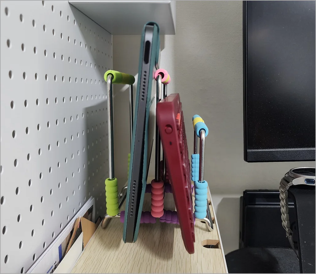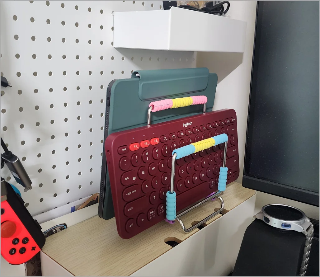 요즘 유행이라는 태블릿 거치대를 완성했습니다. 다이소 도마꽂이(도마거치대)와 펜그립 조합으로 만드는 가성비 거치대! 스테인리스 재질이라 튼튼하고, 쿠션이 있어서 아이패드와 키보드 보관하는데 제격입니다. 가격은 4천~5천 원이라서 부담도 되지 않죠. 문제는 자주 품절이라는 점!